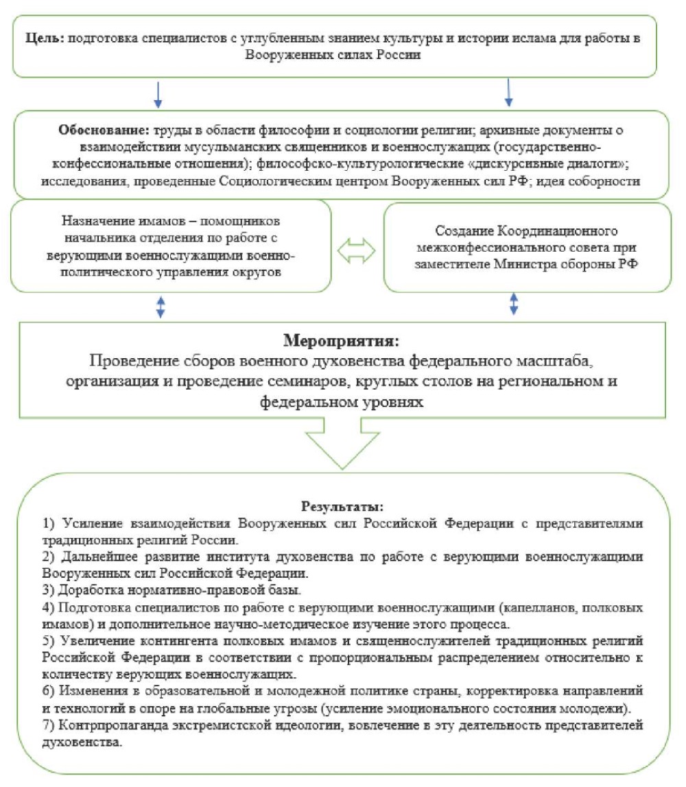 Получается, что миссия священнослужителей в военной среде очень актуальна и политически востребована. При организации их работы в Вооруженных силах РФ важно не игнорировать исторический опыт страны, опираться на современные тенденции развития стран мира, видеть перспективы в дальнейшем развитии взаимоотношений конфессиональных организаций и Вооруженных сил РФ. В этой связи видятся важными научное обоснование, разработка и описание системы подготовки специалистов для работы в Вооруженных силах России на основе программы «Подготовка специалистов с углубленным изучением истории и культуры ислама для работы в Вооруженных силах России».